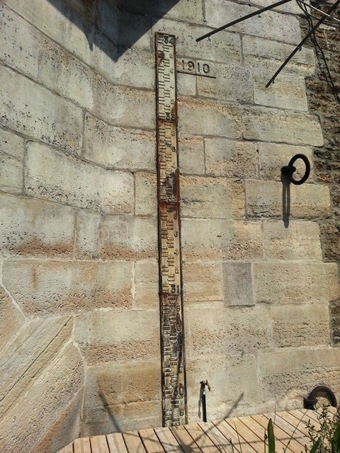 Voici l’échelle de mesure du niveau de la Seine (appelée échelle limnimétrique) et, juste à côté, le fameux repère de la Crue de 1910 à Paris.