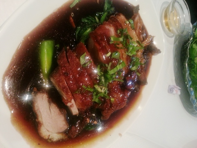 En entrée,  nous avons opté pour des rouleaux de printemps et des saucisses laotiennes. En plat, canard laqué aux trois épices et brochettes d’entrecôtes avec du riz cantonnais (en photo).