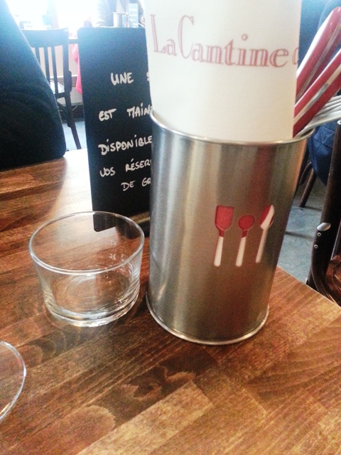 Comme l’endroit revendique son statut de cantine, il n’y a pas de carte (on se lève et on regarde au tableau), la table n’est pas dressée (les couverts sont dans un pot de fer) et il y a certaines règles à respecter (pas de réservation possible, n’importe qui peut s’asseoir votre table, l’addition arrive toute seule avec le café, on ne traîne pas à la fin du repas, etc.). Loin de nous déranger, la formule nous a amusées.