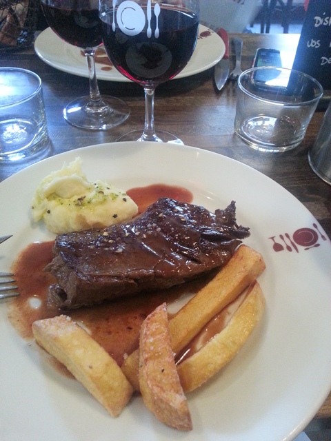 Peu motivées par les entrées proposées, nous avons toutes les deux choisi de manger un onglet. La pièce de bœuf, servie avec des frites et de la purée maison, nous a paru énorme (justifiant ainsi les 18,50€ du plat). Mais surtout, nous avons trouvé la viande succulente. Cela faisait bien longtemps que je n’avais pas mangé de morceau aussi tendre et aussi goûteux. Les accompagnements n’étaient pas en reste.