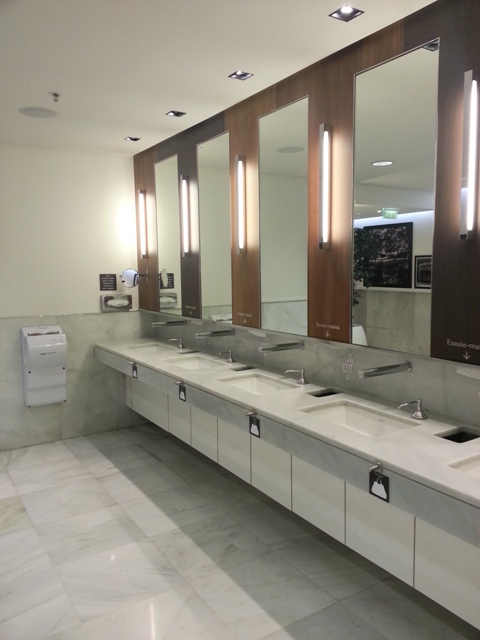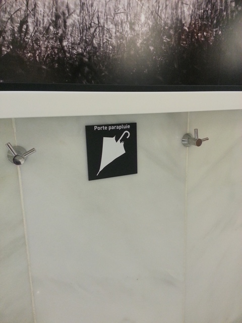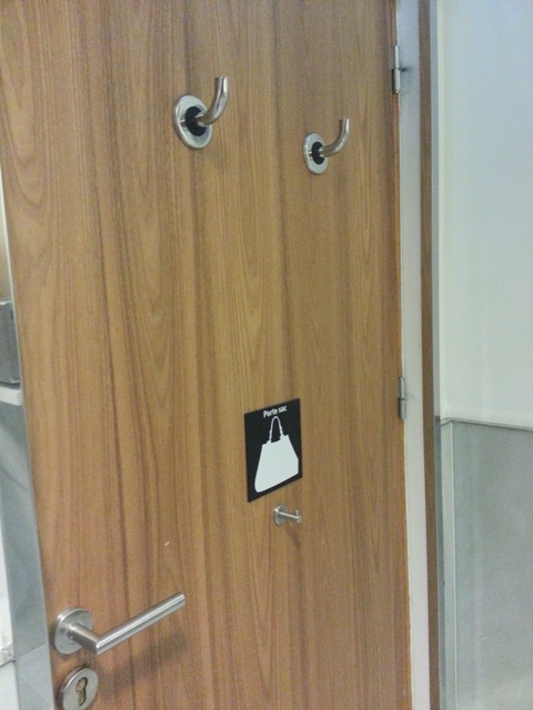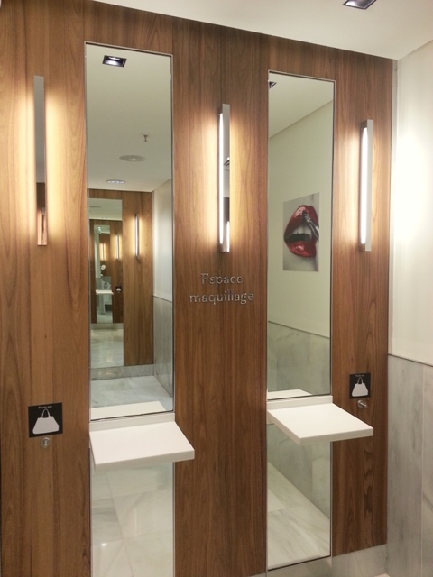 Enfin, je vous laisse admirer les toilettes pour femmes, avec leur espace maquillage, des porte-sacs… et des porte-parapluies.