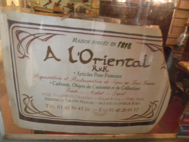 Pipes à effigie, pipes italiennes ou danoises, fume-cigarettes, blagues à tabac, etc. La vitrine de A l’Oriental est un véritable capharnaüm. Située dans les Jardins du Palais Royal (face aux colonnes de Buren), cette maison a été fondée en 1818.