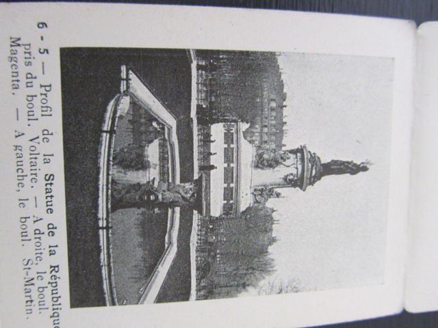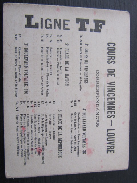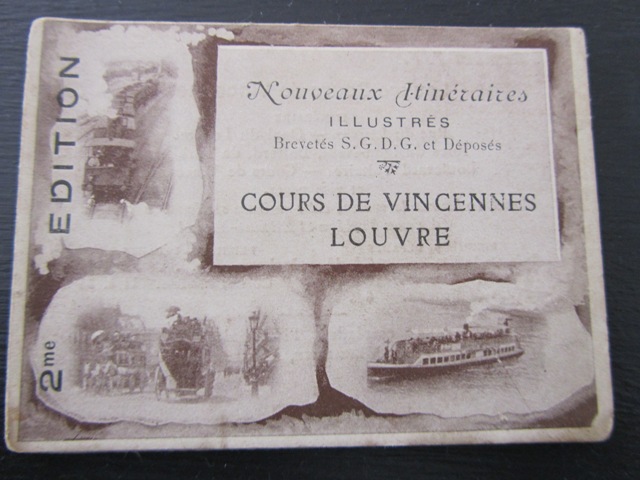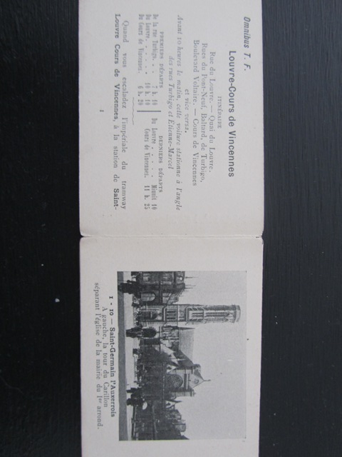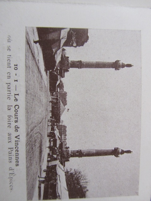 L’édition présentée retrace le parcours de l’omnibus T.F, qui se rendait du Louvre au Cours de Vincennes. Datant du début du 20ème siècle, ce dépliant contient l’itinéraire, les horaires, les correspondances, un descriptif et 10 illustrations photographiques représentant les différents monuments sur le trajet : Halles Centrales, Cours de Vincennes (où se tenait en partie la foire aux pains d’épices), Place de la République (je me suis amusée à la comparer avec la Place de la République 2013), etc. Cela me fait penser à une version ancienne de mon trajet en bus 72 !
