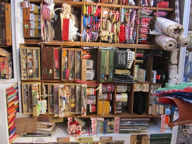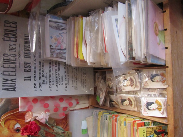 Dès la vitrine, l’œil est attiré par de la broderie ancienne, des fournitures qui rappellent les écoliers du temps passé, des livres d’images et des affiches aux illustrations désuètes.