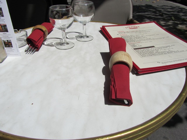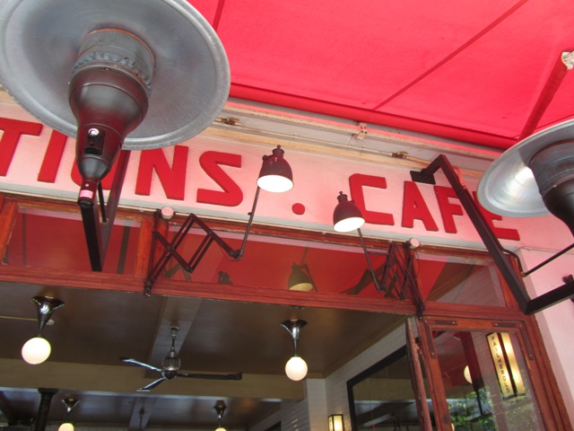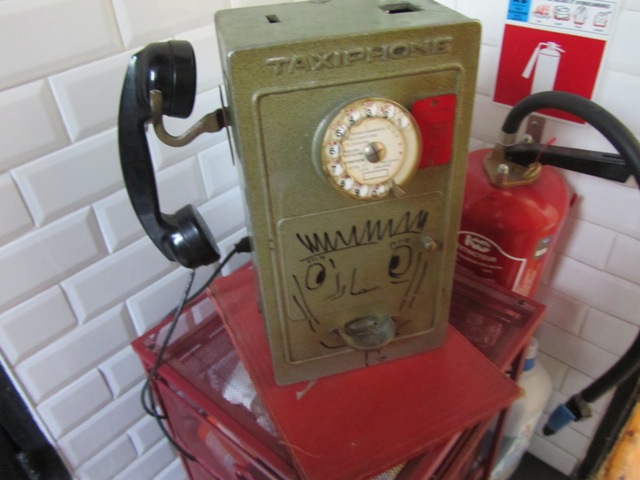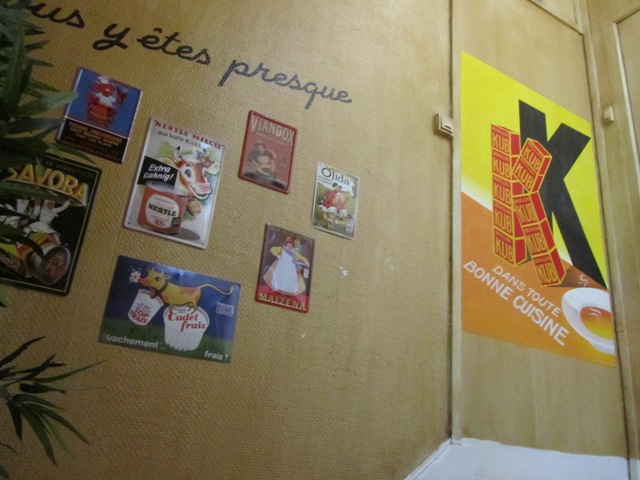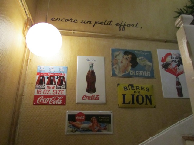 En traversant la grande salle principale, pour accéder d’une terrasse à l’autre, j’ai apprécié la décoration inspirée des années 50 : nappes à carreaux, lampes industrielles, téléphone en Bakélite, réclames sur plaques émaillées,… Une ambiance vintage et chaleureuse, qui change des ambiances lounge à la mode dans les lieux branchés (je n’ai pas dis que je n’aimais pas, je dis juste que le changement est agréable).