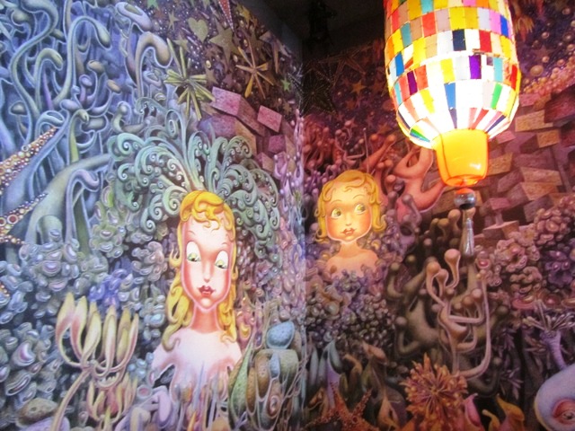 A commencer par la vue. Avec un décor signé Philippe Starck (les lecteurs de ce blog connaissent ma faiblesse pour les lieux qui portent sa touche, du Mama Shelter à Ma Cocotte), l’œil ne peut s’empêcher de partir à la recherche des mille et un détails qui le compose. Mélange de design et d’objets typiquement asiatiques, le concept est moderne et insolite. Et comment ne pas être impressionné par le corps tatoué de Miss Kô, la femme sans visage qui donne son nom au restaurant.