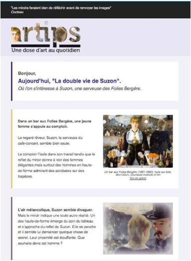 Je reste suffisamment énigmatique pour vous donner envie d’apprécier par vous-mêmes ces mails quotidiens. En moins d’une minute, on (re)découvre des œuvres d’art et on se cultive. Et tout cela gratuitement !