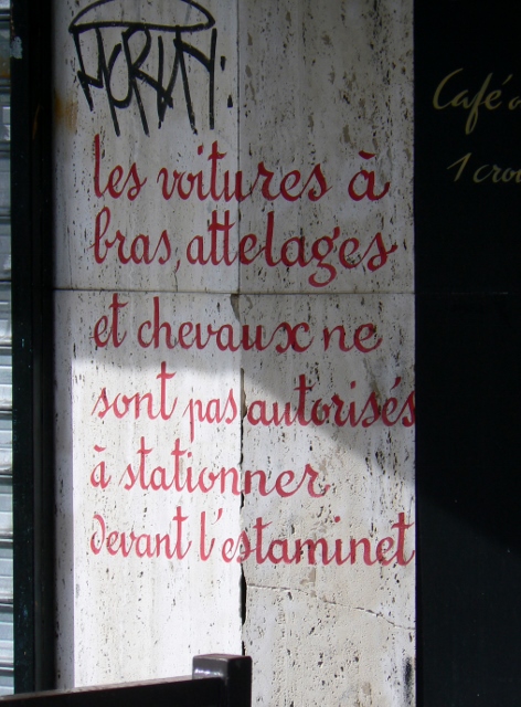 Accueil » Insolite : stationnement interdit aux attelages et aux chevaux rue de TlemcenInsolite : stationnement interdit aux attelages et aux chevaux rue de Tlemcen7 septembre 20138 septembre 2013Visiter Paris4 commentairesVoilà une inscription amusante affichée sur la devanture d’un café de la rue de Tlemcen (75020). Photo : ODL Partagez ! Cliquez pour partager sur Facebook(ouvre dans une nouvelle fenêtre) Facebook Cliquez pour partager sur Pinterest(ouvre dans une nouvelle fenêtre) Pinterest Cliquez pour partager sur LinkedIn(ouvre dans une nouvelle fenêtre) LinkedIn Cliquez pour partager sur WhatsApp(ouvre dans une nouvelle fenêtre) WhatsApp Cliquer pour envoyer un lien par e-mail à un ami(ouvre dans une nouvelle fenêtre) E-mail J’aime ça :J’aime chargement… Similaire Étiquettes:attelagechevauxinsoliteParis 4 commentaires sur “Insolite : stationnement interdit aux attelages et aux chevaux rue de Tlemcen” Armelle 7 septembre 2013 à 8 h 32 min Répondre Amusant et insolite. Nos anciennes interdictions de stationner devant nos passages cochers ! Bon weekend Sheily Parisienne 7 septembre 2013 à 9 h 32 min Répondre Bon weekend Armelle ! lalydo 7 septembre 2013 à 10 h 03 min Répondre Mince, moi qui voulait venir avec mon cheval… :/ Sheily Parisienne 7 septembre 2013 à 11 h 59 min Répondre Désolée, mais pas cette fois ;-)! Laisser un commentaireAnnuler la réponse. Ce site utilise Akismet pour réduire les indésirables. En savoir plus sur la façon dont les données de vos commentaires sont traitées.