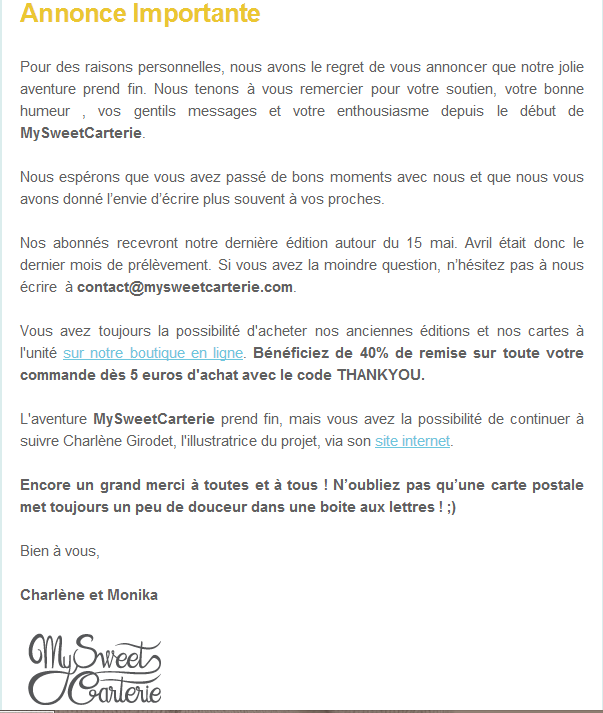 Edit du samedi 13 mai 2014 : MySweetCarterie, c’est fini… J’ai appris cette triste nouvelle en recevant l’email ci-dessous. Je suis navrée que ce joli projet soit terminé..