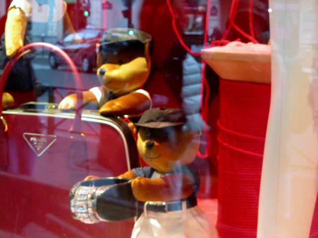 En revanche, j’ai trouvé que cette scénographie manquait cruellement de jouets pour émerveiller les enfants. Je voulais des poupées, des trains, des peluches, des voitures, des marionnettes… Je n’ai vu que les oursons animés qui, pour la plupart, présentaient des articles Prada.