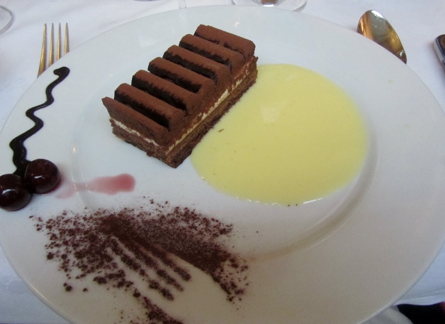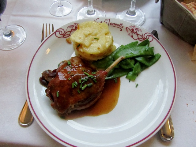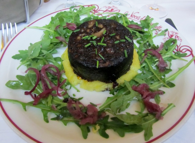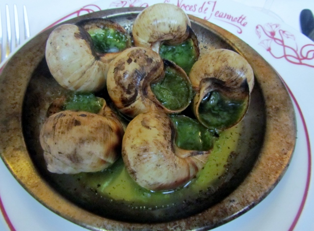 De l’entrée au dessert, Mon Héros et moi avons dégusté chaque plat avec beaucoup de plaisir. Nous avons également découvert un excellent Beaujolais (pas nouveau) qui accompagnait parfaitement le repas. Je vous recommande sans hésiter de déguster les Escargots de Bourgogne, la Cuisse de canard rôtie aux épices, le Boudin noir aux piments d’Espelette de Christian Parra et le Croustillant au chocolat amer.