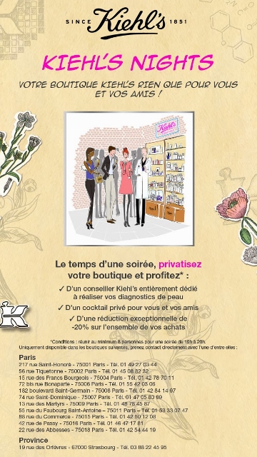 Je connais la marque Kiehl’s de nom depuis longtemps, mais leurs produits ne faisaient pas partie des cosmétiques que j’utilisais au quotidien. Je les ai testés pour la première fois à l’hôtel, sous forme d’échantillons, puis j’ai remarqué l’ouverture des boutiques de la rue Tiquetonne et de la rue Saint Honoré. Je suis entrée par curiosité, mais sans vraiment manifester plus d’intérêt. Il a fallu que je participe à une Kiehl’s Night (une boutique Kiehl’s privatisée rien que pour vos amis et vous) pour découvrir leur offre dans le détail.