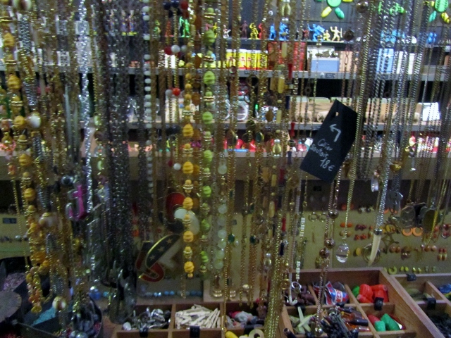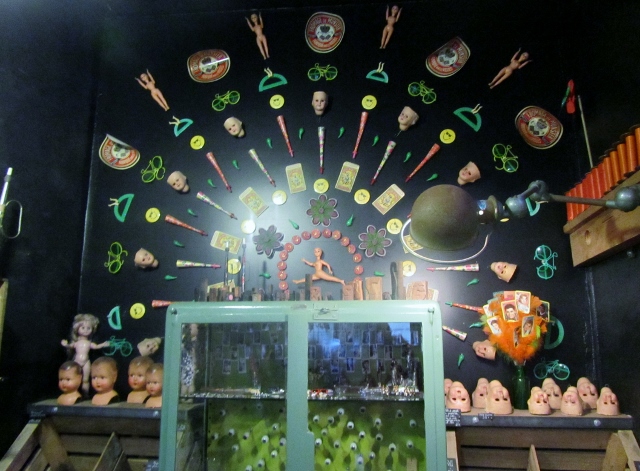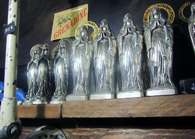 Dès la façade, un panneau d’affichage donne le ton : lots anciens et oubliés, bijoux, perles et accessoires de mode, stocks exclusifs d’usines abandonnées, séries industrielles, fonds de mercerie en abondance, jouets manufacturés du siècle dernier, matériel de laboratoire (je n’ai rien vu qui y ressemble), petits objets de culte à profusion, stocks de fabricants et grossistes, souvenirs des enseignes d’autrefois, trésors artisanaux en quantité, accumulations en tout genre, gadgets historiques et traditionnels et archéologie de l’enfance.