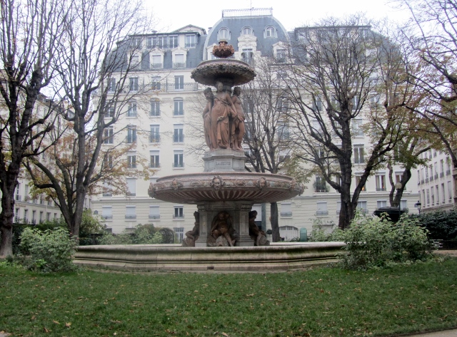 Au premier regard, la fontaine qui trône au centre du Square Louvois paraît démesurée pour un jardin aussi modeste.