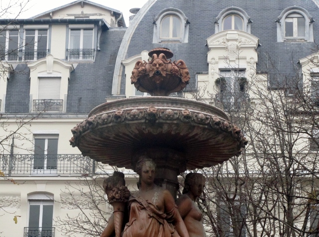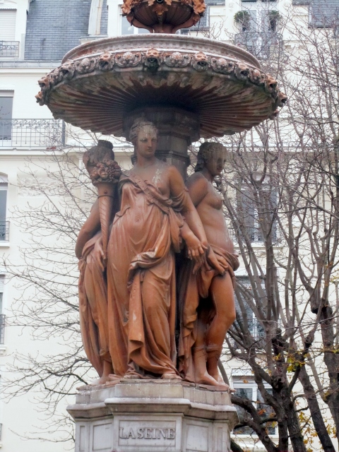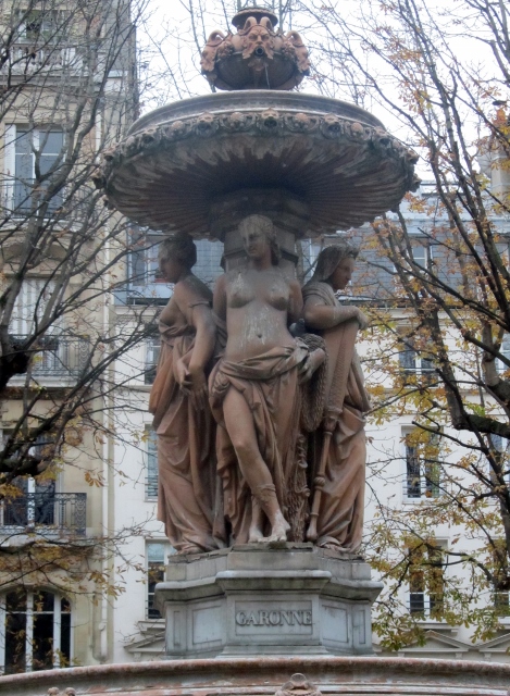 Cette fontaine, oeuvre de l’architecte Louis Visconti, est ornée de sculptures de Jean-Baptiste Jules Klagmann qui symbolisent la Seine, la Loire, la Saône et la Garonne. Je trouve ces représentations féminines des fleuves superbes. Et vous ?