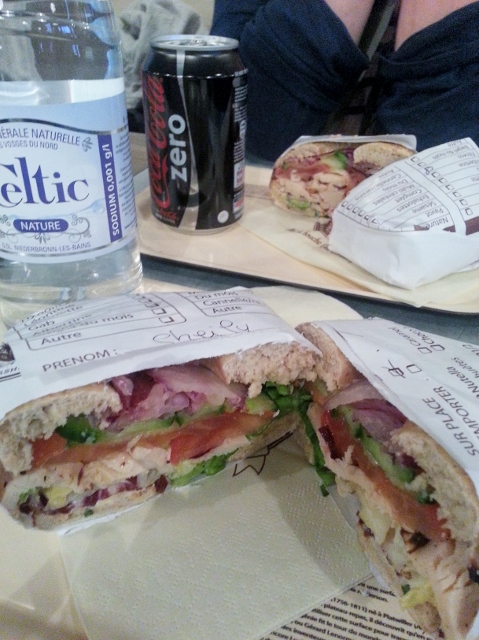 Qu’est-ce qu’on mange ? Du bagel à toutes les sauces ! Pour notre déjeuner light, nous avons opté pour un Fitness : bagel au pain complet, Cream Cheese light, concombre, tomate et poulet fumé. Nous avons rencontré un petit problème pour choisir le dessert : cookies, muffins, tarte au chocolat, crumble… Pas l’ombre d’un yaourt 0%. Je n’ai pas manqué de signaler cette déception à la charmante caissière qui m’a répondu que beaucoup de femmes faisaient cette réflexion. Elle m’a racontée que le fromage blanc et la salade de fruits (qui figurent au menu aux beaux jours), disparaissent de la carte pendant la saison hivernale… C’est la seule ombre au tableau, mais c’est expliqué avec le sourire, donc on n’en tiendra pas rigueur.