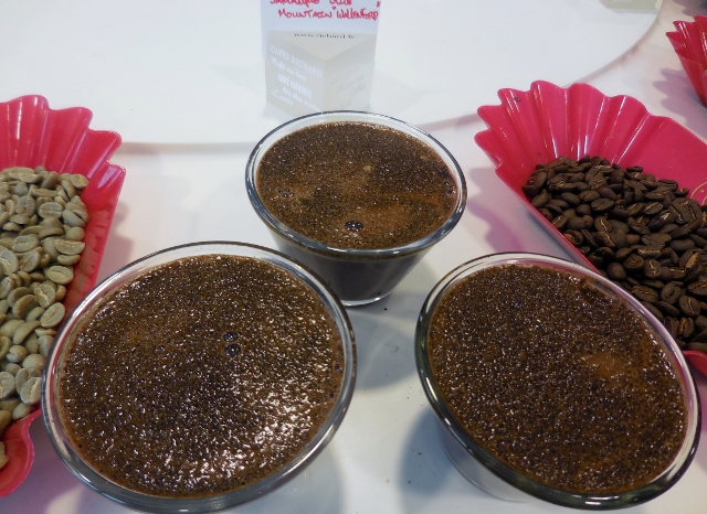 Michael McCauley nous a rejoint pour les quatre étapes de l’art de la dégustation du café : cupping (on verse de l’eau sur le café moulu), infusion (2 minutes pour que le marc remonte à la surface), on “casse la croûte” afin de repousser le marc au fond, puis analyse du contenu de chaque tasse. L’opération était d’autant plus intéressante que nous avons analysé divers café les uns à la suite des autres, pour mieux appréhender leurs différences.