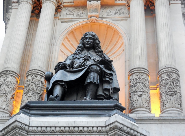 Au-dessus de lui, dans le fronton, un petit génie se tient assis sur d’opulentes guirlandes.