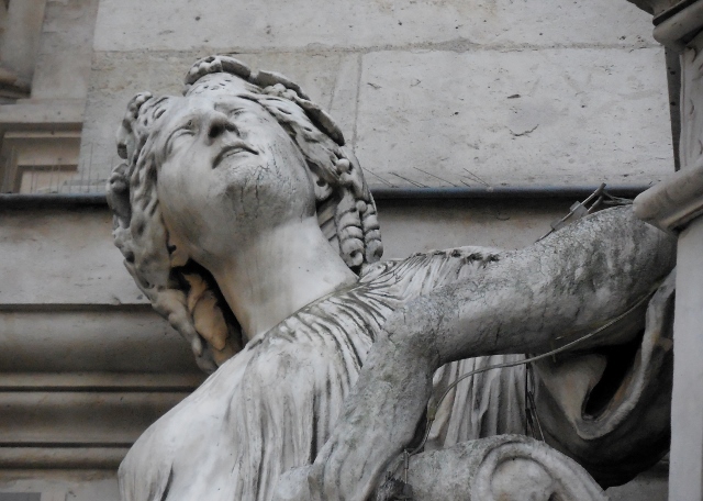 Deux femmes en marbre, la Comédie sérieuse et la Comédie légère, sont disposées en contrebas de chaque côté et sont l’œuvre de Jean-Jacques Pradier (1792 – 1852). Elles tiennent chacune un parchemin où sont listées les œuvres du grand dramaturge. Au niveau inférieur des mascarons à tête de lion crachent l’eau dans une vasque semi-circulaire.