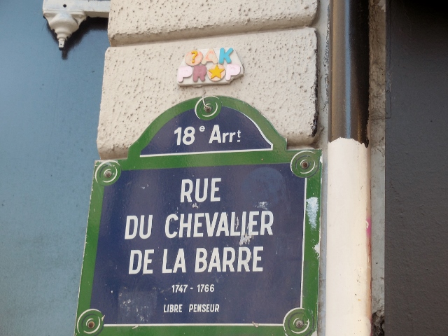 “La rue du Chevalier-de-La-Barre porte le nom de Jean-François Lefèvre, chevalier de La Barre (1746-1766), jeune homme condamné à la torture et à la mort par décapitation en 1766 pour n’avoir pas retiré son chapeau au passage d’un cortège religieux. Ce nom fut choisi par les anticléricaux de la Troisième République alors que le Sacré-Cœur était en cours de construction”. Source : Wikipedia.