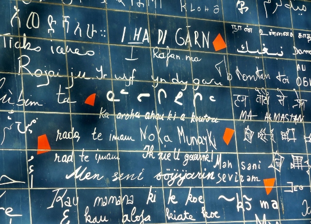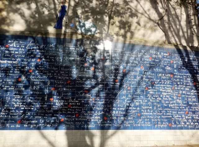 Frédéric Baron et Claire Kito ont réalisé ce Mur des je t’aime en 2000, sur des carreaux de lave émaillée. Cette oeuvre rassemble 311 écritures manuscrites de “je t’aime”, dans 280 principales langues et dialectes de la planète.