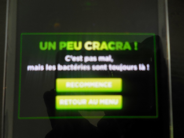 L’application comporte un scanner de détection de mains sales (les parents peuvent moduler les résultats), un jeu proposant d’éliminer des “Bacterribles”, et une galerie des “Bacterribles”. Pour commencer, nous avons vérifié si les mains de ma nièce étaient cracra ou pas. Le scanner a détecté les bactéries et jaugé la propreté des mains : un peu cracra. Elle est allée les laver sur le champ.