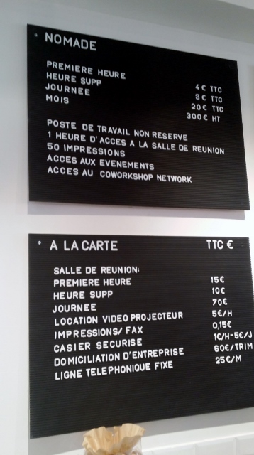 En termes de tarifs, Coworkshop s’aligne sur ses concurrents que je connais, comme l’AntiCafé ou le Numa. Le tarif de base (4€ la première heure, puis 3€/heure supplémentaire) inclus le wifi et les boissons chaudes à volonté. Ici, pas de buffet à volonté, du coup la population qui fréquente les lieux est plus âgée. La situation géographique explique également le fait qu’il y ait moins d’étudiants qu’ailleurs.