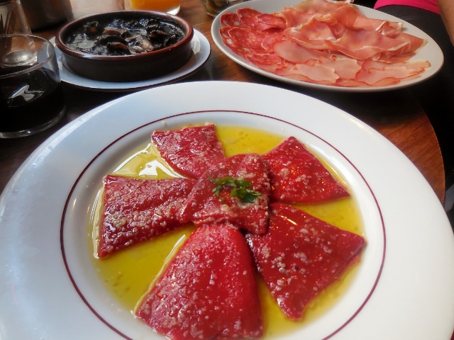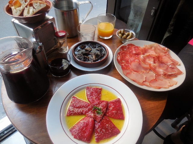 Je précise tout de même que la charcuterie est à se damner, ainsi que les chipirons tinta (calmars à la sauce à l’encre) et les sardines plancha. Les poivrons de Piquillo poêlés (poivrons doux poêlés à l’huile d’olive et à l’ail) sont également divins. Le chef (l’ancien chef de cuisine de La Plancha rue Keller) possède des recettes secrètes pour accommoder tous les plats. Je précise que j’ai beaucoup saucé au cours du repas…