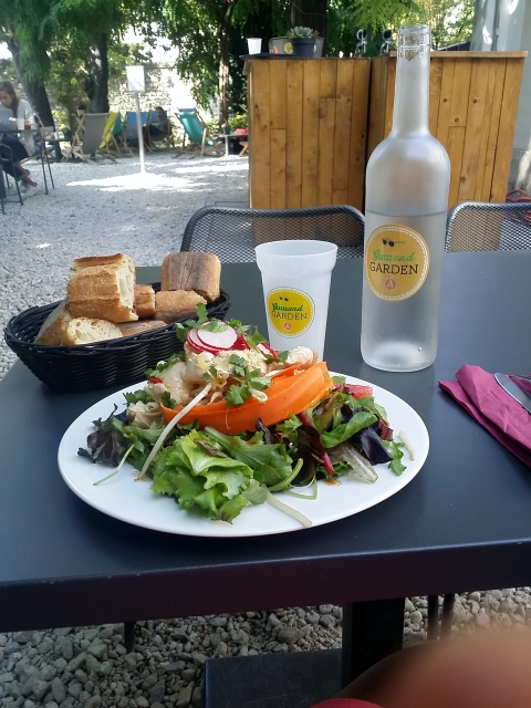 Qu’est-ce je recommande ? La carte n’affiche que quelques plats très simples (hamburgers, salades, assiettes de charcuterie ou de fromage et un plat du jour) . La salade Shangri-La que l’on m’a servie (poulet mariné et crudités) n’avait rien d’extraordinaire. Mais je voulais manger sur le pouce, au calme et au soleil, et de ce point de vue, j’ai été servie.