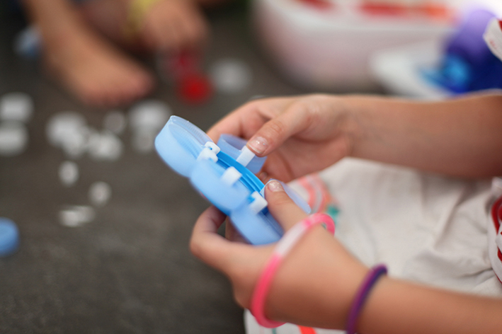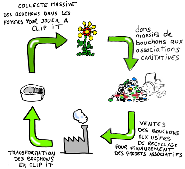 A noter également que la fabrication du jeu s’inscrit dans une démarche d’économie circulaire. Les associations caritatives assurent la collecte des bouchons de bouteille. Leur transformation en clip est assurée en France par des circuits de production locaux qui les rachètent par tonnes aux associations. Le jeu est conditionné et distribué par des Centres d’Aide par le Travail (CAT) tel que l’ESAT la Croix Verte à Montpellier. Les utilisateurs n’ont plus qu’à collecter chez eux les bouchons, auparavant destinés au recyclage, pour en faire les pièces maîtresses de leurs œuvres assemblées grâce aux clips. A terme chaque foyer se retrouve avec une grosse quantité de bouchons. Une fois l’enfant désintéressé du jeu, il ne lui reste plus qu’à en faire don aux associations caritatives et le recyclage reprend.