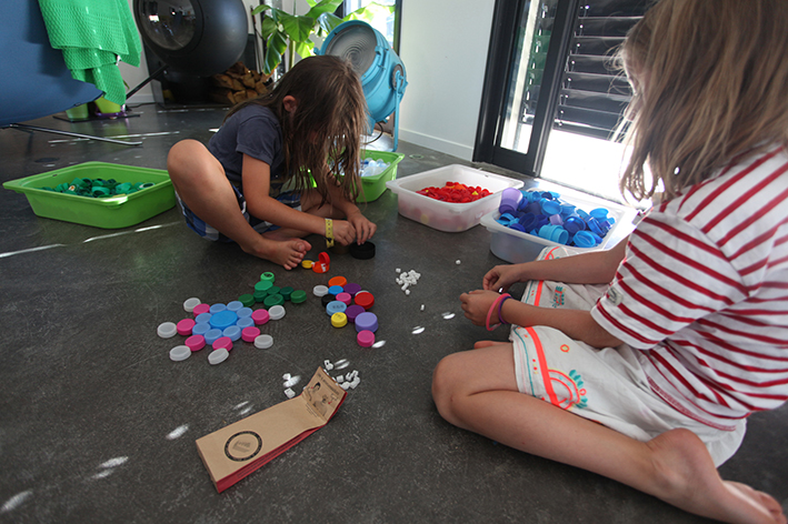 C’est le premier jeu 90% surcyclé, c’est à dire, qui permet de réutiliser et revaloriser les déchets directement, sans coût énergétique lié à leur transformation (comme avec le recyclage). En effet, les enfants récupèrent à la maison les bouchons de bouteilles (eau, lait, soda, jus de fruits, etc…) et composent des formes grâce à la « clé d’assemblage » du jeu. Les clips sont quant à eux clips issus de bouchons en plastique recyclés !