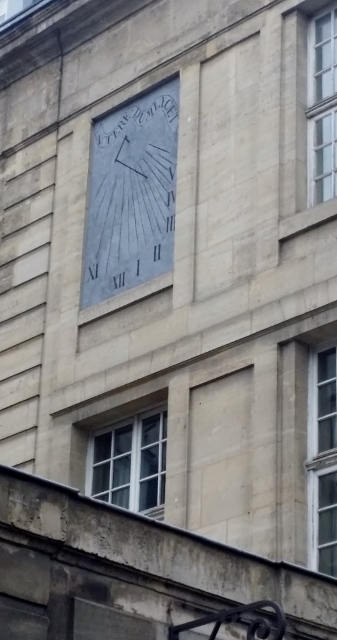 L’imposante porte rouge a d’abord attiré mon regard. Puis l’inscription, à peine lisible du médaillon : Ancien couvent des Pères de la Merci… Cet hôtel particulier du 46 rue des Archives abrita jadis un couvent. Il possède deux cadrans solaires (un pour le matin et un pour l’après-midi), mais je n’ai pu en apercvoir qu’un seul… Un de plus dans ma liste de cadrans solaires parisiens !