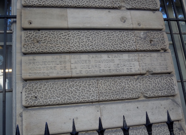 « Le 11 mars 1918 Paris étant bombardé, des projectiles lancés d’avions tombèrent sur le ministère de la guerre où Georges Clémenceau dirigeait alors le gouvernement de la République ».
