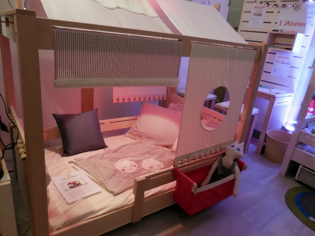 Mon plus gros coup de coeur revient incontestablement au lit évolutif “Jeune Pousse” de Vibel. Il se compose d’un lit 90 X 150cm en bois naturel, d’un sommier et d’un petit toit plat ou « comme une maison ». Avec ses protections latérales et sa hauteur proche du sol, il permet à l’enfant d’aborder la transition d’un lit de bébé à un lit de grand en toute sécurité. L’option pupitre en pied de lit permet d’optimiser l’espace avec un bureau. Les accessoires, poches, protections mousses en tête et pied de lit, sont également très pratiques. Comme il s’agit d’un lit évolutif, on peut ensuite ajouter le kit transformation « Arbrisseau » et passer du lit intermédiaire à un couchage 90X190cm.