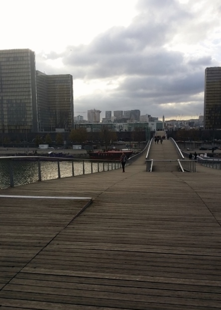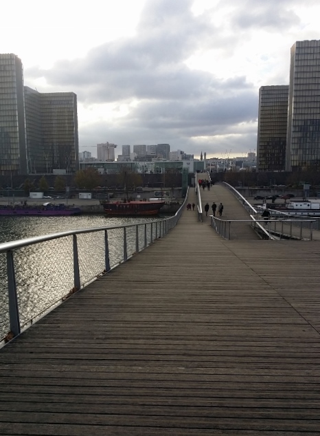 Ce mois-ci, pour la première fois, j’ai effectué de trajet du Parc de Bercy à la Bibliothèque Nationale de France. C’est donc en toute logique que j’ai traversé pour la première fois la Passerelle Simone de Beauvoir, que jusqu’ici, je m’étais contentée de l’observer depuis le parvis de la BNF (ou depuis les autres ponts situés à proximité).