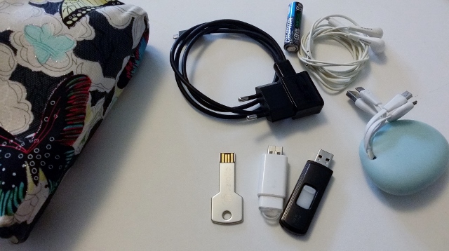 Du côté Geek, vous trouverez : pas moins de 3 clés USB (dont une de 16GB, car je n’en ai jamais assez) ; le câble pour charger mon téléphone ; un adaptateur multi-prise Xoopar (le couteau suisse des adaptateurs, qui permet la charge, la connexion et la synchronisation de tous mes appareils via une prise USB) ; mes écouteurs ; une pile de rechange pour remplacer celle de ma souris sans fil si nécessaire).