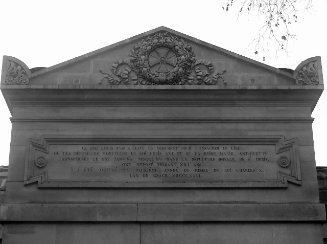 La Chapelle Expiatoire se trouve dans le square Louis-XVI, un jardin qui recouvre l’ancien cimetière de la Madeleine où sont inhumés 3 000 victimes de la Révolution. Construite sur décision de Louis XVIII, elle est consacrée à la mémoire des dépouilles de Louis XVI et Marie-Antoinette, qui y reposèrent jusqu’à ce qu’elles rejoignent la Basilique Royale de Saint Denis (le 21 janvier 1815).