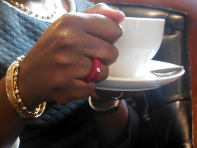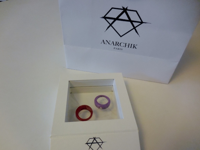 Comme je ne résiste jamais à un joli bijoux, c’est avec une joie non dissimilée que j’ai accepté de créer ma bague personnalisée Anarchik. Mon choix s’est porté sur un pavé diamants, accompagné d’un anneau rouge rubis et d’un anneau pourpre (soit un total de 149€, le prix étant immédiatement calculé en fonction de la pierre sélectionnée). J’ai trouvé le choix de la pierre particulièrement aisé : nous avons tous nos préférences et nos contraintes budgétaires. En revanche, le choix de couleur des anneaux s’est révélé fort difficile. Toutes me plaisaient, et j’essayais d’imaginer virtuellement avec quelles tenues je pourrais les porter. J’ai sélectionné des tons qui s’accorderaient aussi bien avec des vêtements de mêmes teintes, qu’avec un look total noir. Pour la taille, j’ai tenu compte du fait que le silicone est une matière extensible. Aussi, j’ai choisi Medium car je souhaitais porter mes anneaux au majeur. La taille est parfaite mais serait bien trop large pour l’annulaire. L’installation de la pierre se fait en moins de deux secondes et l’effet est superbe. Depuis, je m’en donne à coeur joie pour des séances photos de mes mains : j’ai assorti mes anneaux à mes vêtements, à ma déco et même à mes stylos.