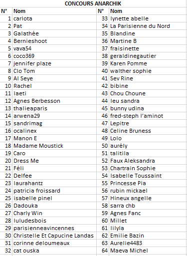 Le numéro 50, soit Aurély ! Félicitations à vous et merci de bien vouloir m’envoyer un email contenant le rappel des coloris des deux anneaux, la taille, ainsi que votre adresse postale complète.