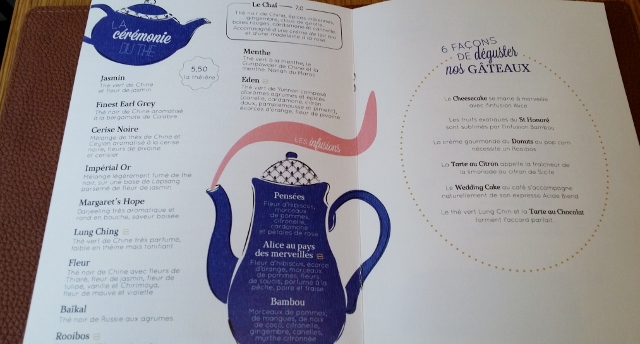 Je m’étais rendue sur place à plusieurs reprises pour acheter des desserts à emporter, et c’est finalement pour un Afternoon tea que je me suis installée en salle. Le lieu est cosy, la décoration charmante, avec des théières dans la vitrine, sur la couverture et les pages de la carte… et aussi en guise de lampes.