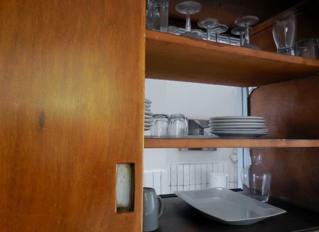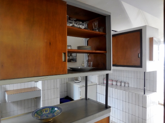 Pour la cuisine, deux meubles dessinés par Charlotte Perriand servent à la fois de plan de travail et de placard.