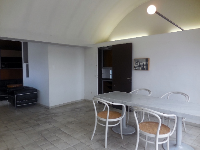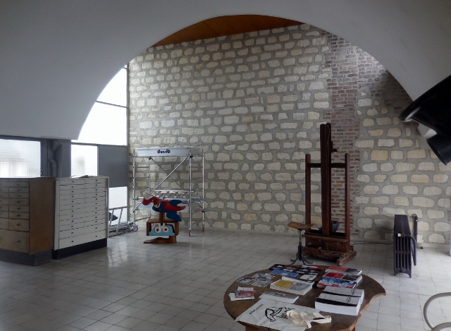 Les trois éléments caractéristiques de ces espace atelier sont : la grande voûte blanche de près de 6 m de large, 12 m de long et 3,50 m de haut ; le pan de verre ouvrant sur l’est (malheureusement un peu endommagé à l’heure actuelle) ; le grand mur de moellons et de briques laissés apparents.