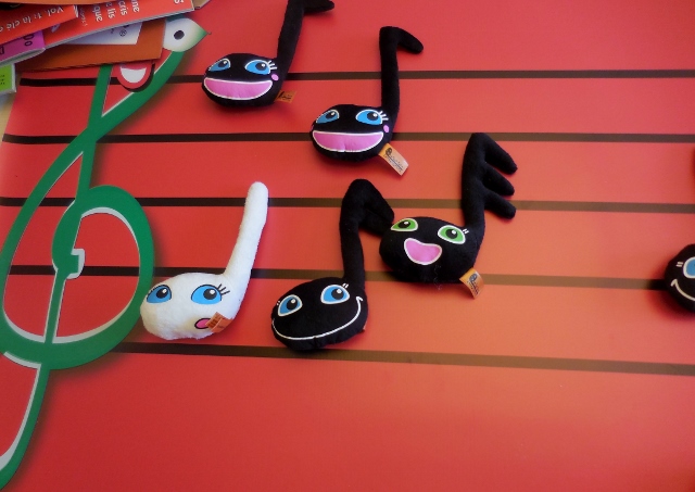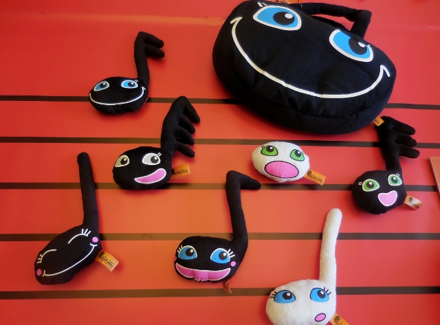 Les Doudounotes se composent de 7 peluches. Chaque peluche représente la ronde, la blanche, la noire, la croche, la double croche, la triple croche et la quadruple croche. Elles permettent ainsi aux enfants d’apprendre les valeurs de note tout en douceur. Rangées dans un sac-peluche « Maman Note » facilement transportable, l’enfant peut les emporter partout.