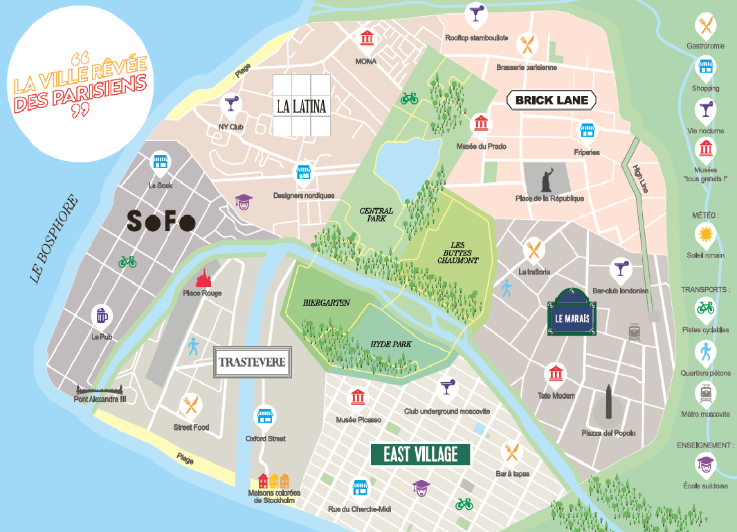 Paris, Rome et New York sont les villes qui se rapprochent le plus de l’idée que les Parisiens se font de la ville idéale. L’interrogation d’un échantillon représentatif de Parisiens place Paris en première position des villes qui correspondent à l’idée que se font les Parisiens de la « ville idéale » : 27 % d’entre eux se prononcent en faveur de Paris, 22 % en faveur de Rome et 16 % en faveur de New York. Paris concilie deux critères jugés déterminants pour les Parisiens : la qualité de l’offre gastronomique et la diversité de l’offre culturelle. Et cependant, 36 % des Parisiens seraient prêts à quitter Paris pour s’installer provisoirement à New York. Voyons comment je me positionne face à ces résultats…