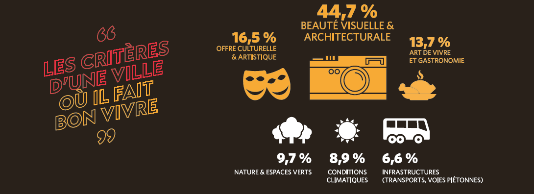 À l’heure de l’hyper-concentration urbaine et du développement des mégalopoles, Rome reste une capitale à taille humaine. Elle incarne encore un équilibre de vie où le Bien-être et la gastronomie jouent un rôle clé. Pour 27 % d’entre eux, elle se rapproche de l’idée d’une ville idéale. Au-delà du cliché, la “ Dolce Vita” reste une réalité que Rome rend toujours possible. Ne connaissant pas Rome, j’ai du mal à me prononcer sur ce point.