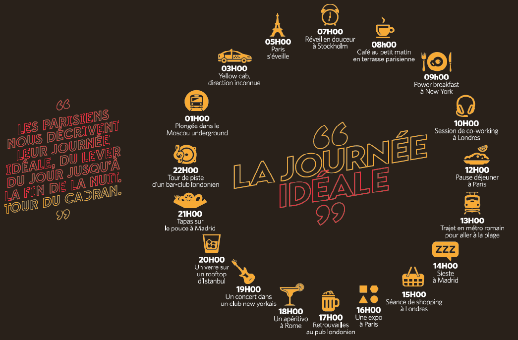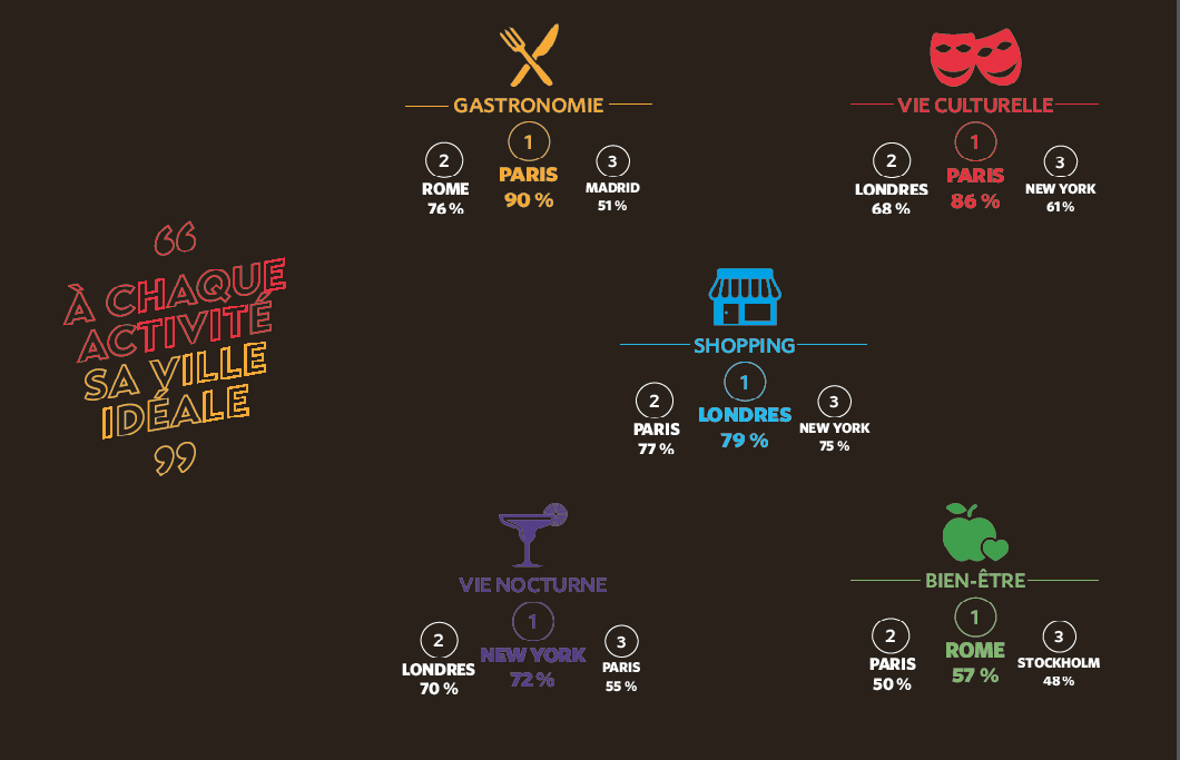 Etude conduite par happycurious pour MasterCard. Elle repose sur l’interrogation d’un échantillon représentatif de 808 Parisiens. Ce palmarès compare les villes sur 9 grandes villes internationales membres du réseau « Priceless Cities ».