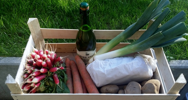 Le jour J, j’ai reçu mon panier de légumes, un pain de campagne moulé et une bouteille de cidre brut. Une recette de salade de poireaux et de pommes de terre à la vinaigrette (produits contenus dans le panier) avait été glissée dans la commande.