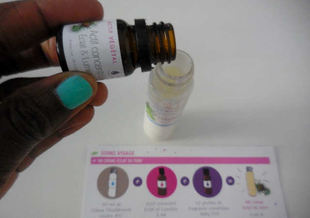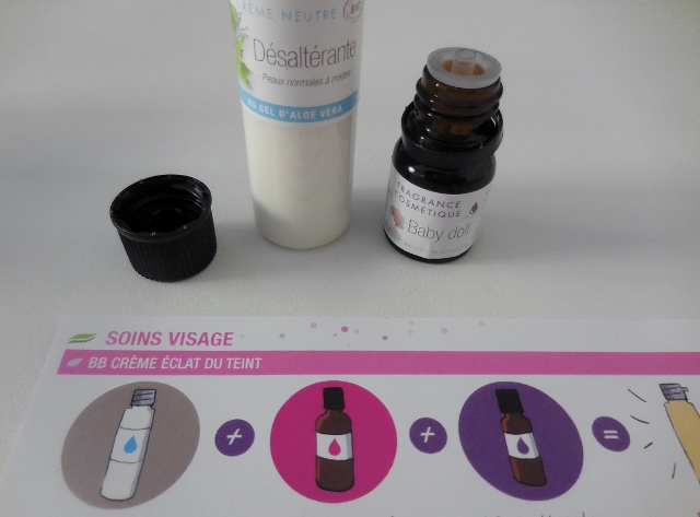 Afin de vous montrer le niveau de simplicité, j’ai réalisé une BB crème éclat du teint en trois étapes de moins de trois minutes. Dans mon flacon de crème désaltérante neutre bio, j’ai intégré 2 ml d’actif concentré Eclat de lumière et dix gouttes de fragrance cosmétique Baby Doll.