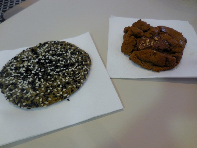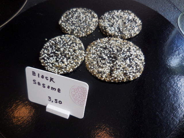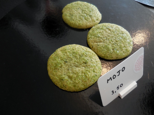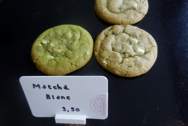 Quand je suis passée, Jean venait de se faire dévaliser de la précédente fournée. Mais j’ai quand même trouvé des rescapés. Mes coups de coeur ? Mojo (Mojito cookie, citron vert, menthe et rhum de Chamarel de l’Ile Maurice) ; Hall and Oats (Flocons d’avoine et raisins secs) ; et Black Sesame (Poudre de sésame noir de Taiwan)