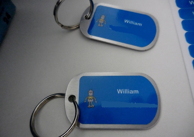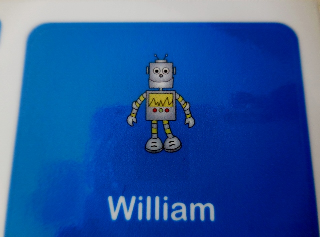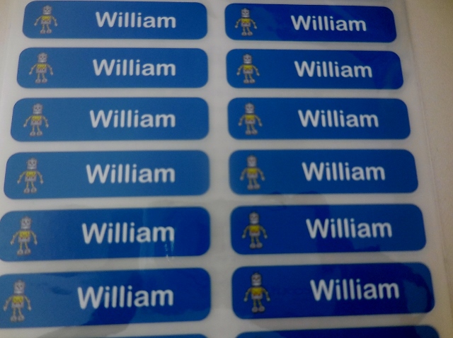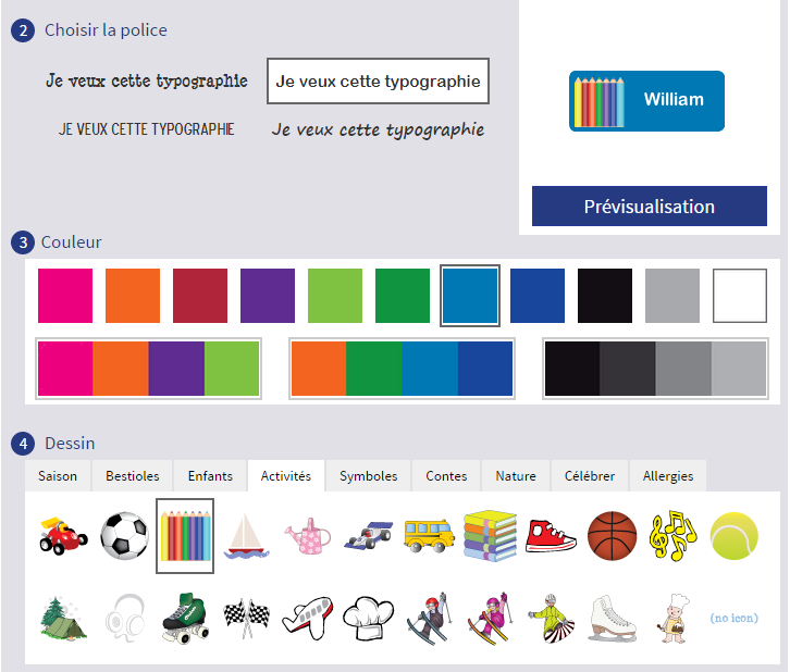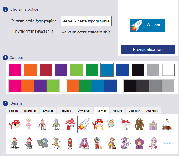 Pour commencer, la création des étiquettes est très facile. Il suffit de personnalisé son pack avec le choix du texte, de la police, de la couleur et du dessin. A chaque changement, un petit écran de prévisualisation montre le résultat obtenu (en haut à droite). A la demande de Mon Lutin, j’ai choisi du bleu et un robot.